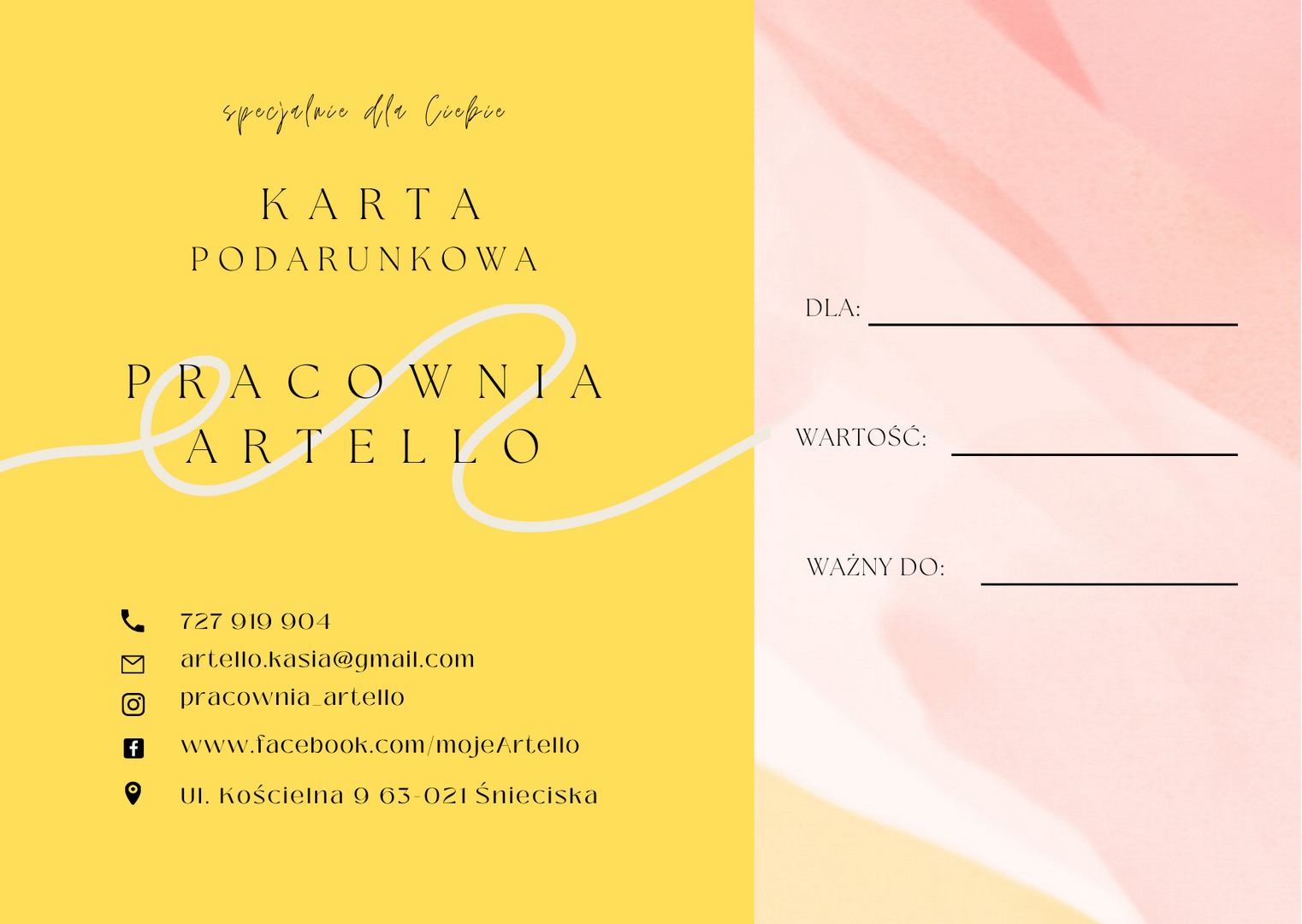Chcesz sprawić prezent bliskiej osobie, ale nie wiesz co dokładnie jej się spodoba? Mam dla Ciebie propozycję: Karta podarunkowa w wysokości 50zł od Pracowni Artello. Wystarczy, że obdarowana osoba skontaktuje się ze mną i razem ustalimy na co chciałaby przeznaczyć swój prezent. Dostępne są ręcznie malowane obrazy, dekoracje, poduszki i inne upominki w różnych cenach więc z pewnością każdy znajdzie coś dla siebie. Można także wykorzystać kartę w celu złożenia spersonalizowanego zamówienia a wtedy razem ustalimy szczegóły.