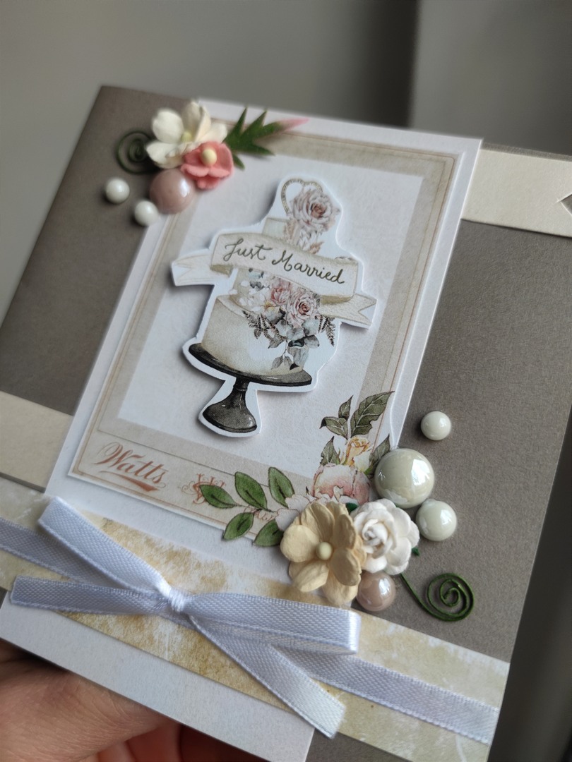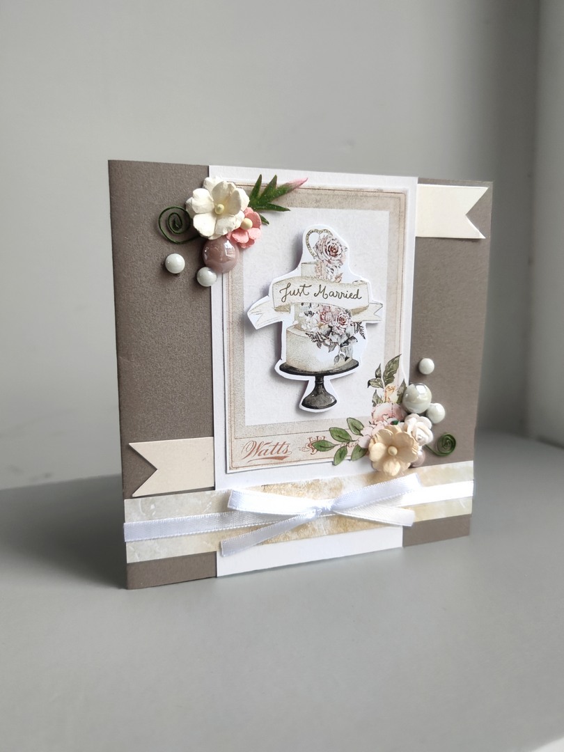 Ręcznie wykonana i jedyna w swoim rodzaju kartka okolicznościowa. Idealnie sprawdzi z okazji ślubu. Kolory które dominują to beże, brązy oraz biel.