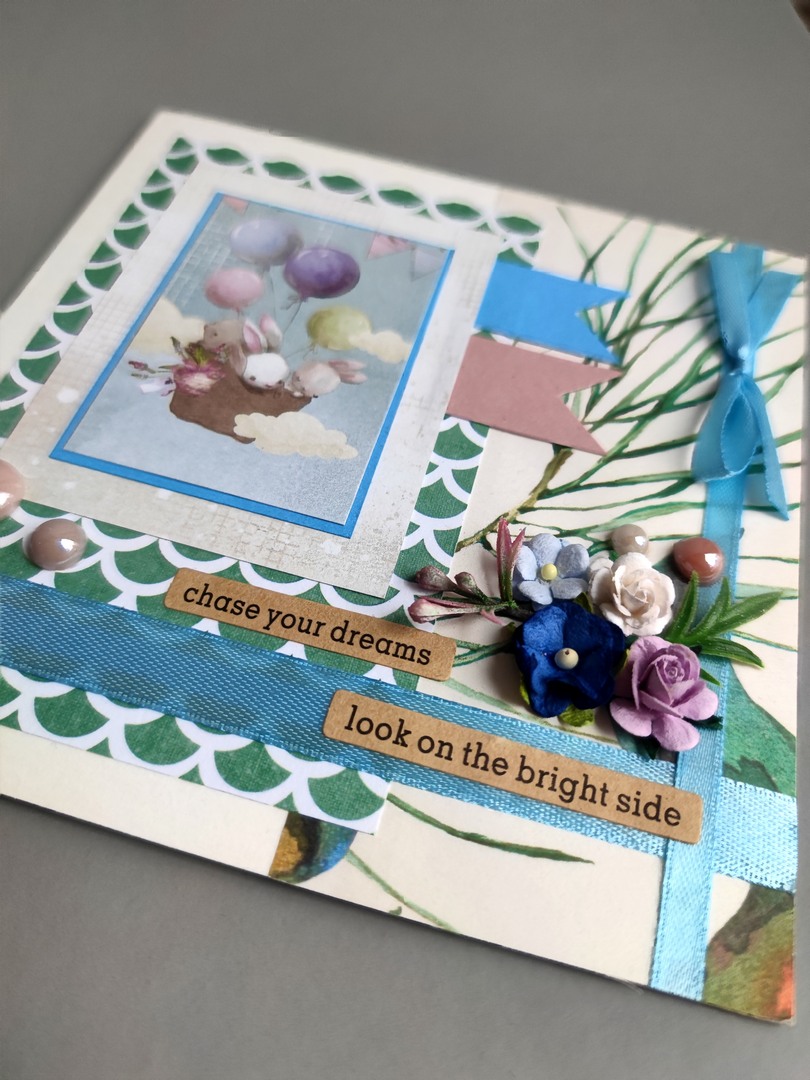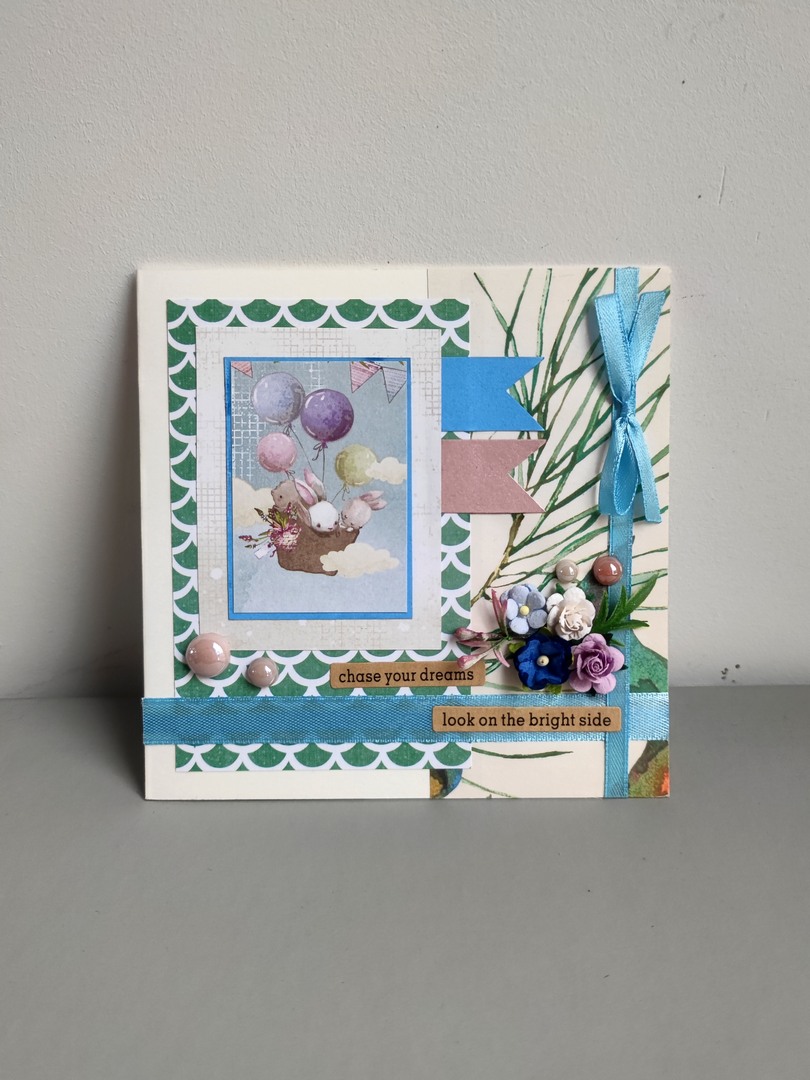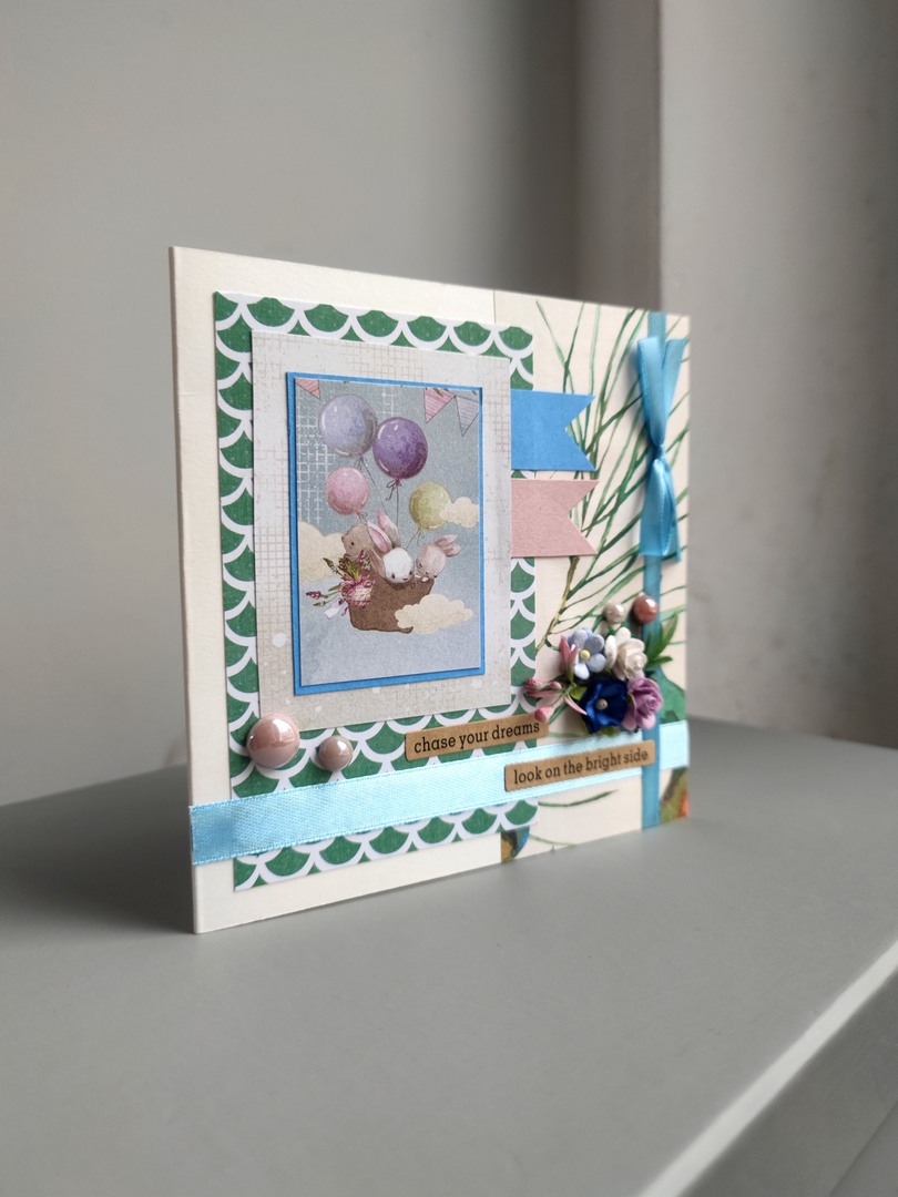 Ręcznie wykonana i jedyna w swoim rodzaju kartka okolicznościowa. Idealnie sprawdzi się na różne okazje. Kolory które dominują to zielenie, błękity, fiolet i biel.