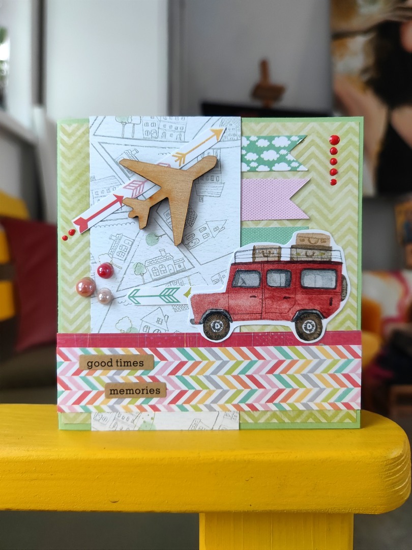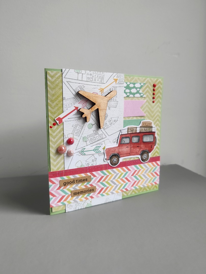 Ręcznie wykonana i jedyna w swoim rodzaju kartka okolicznościowa. Dla kogoś, kto uwielbia podróże, i te małe i te duże. Kolory które dominują to zieleń, czerwień i biel.