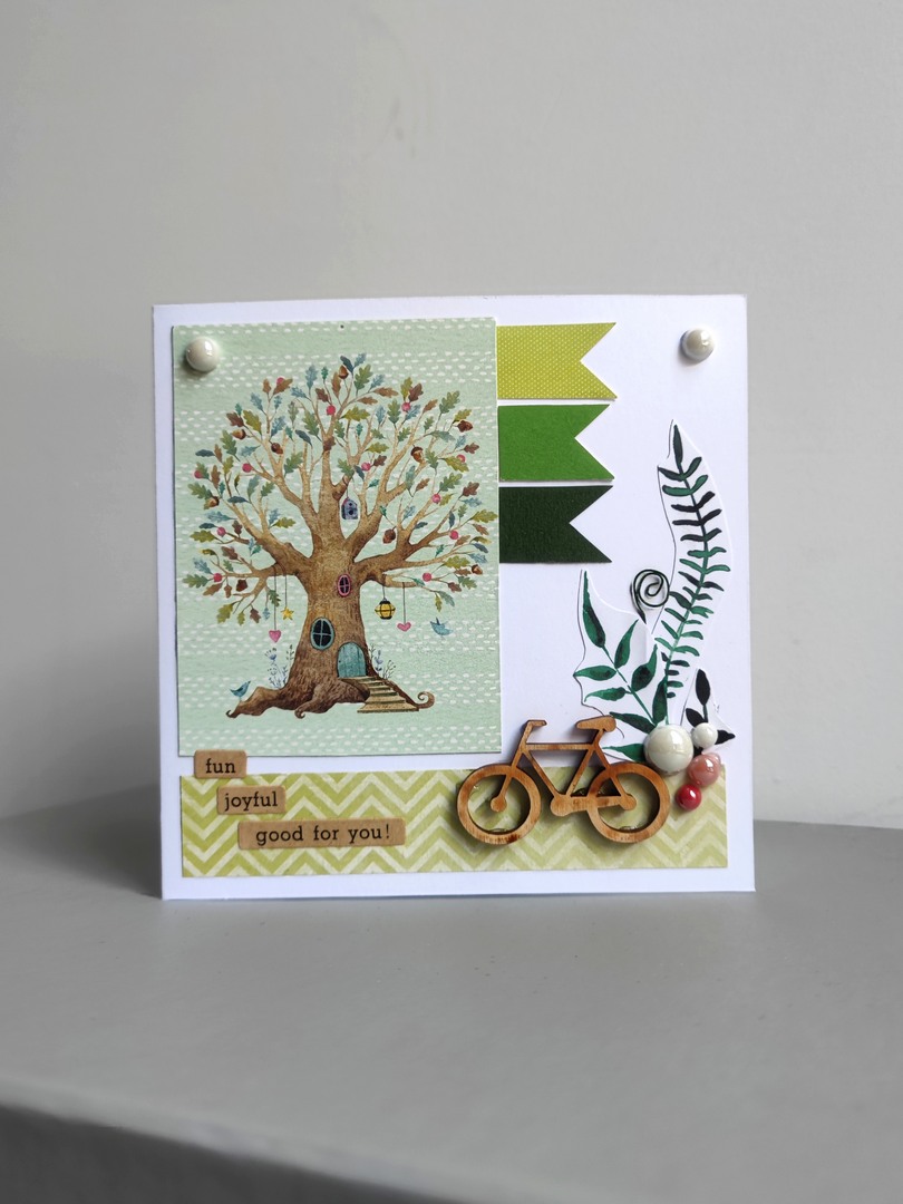 Ręcznie wykonana i jedyna w swoim rodzaju kartka okolicznościowa. Dla kogoś, kto uwielbia rowerowe przygody. Kolory które dominują to odcienie zieleni, brąz i biel.