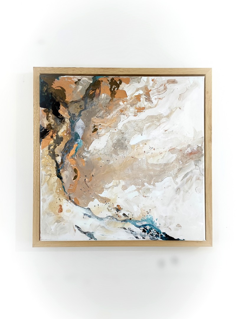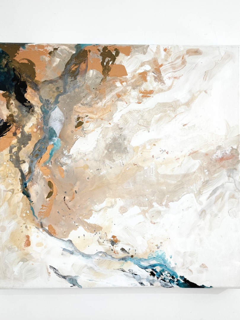 Abstrakcyjna kompozycja łącząca w sobie odcienie bieli i beży przeplatających się z mocniejszymi akcentami czerni, miedzi i granatu. Świetnie sprawdzi się w nowoczesnym wnętrzu i stanowi ciekawy element wystroju. Obraz namalowałam na podkładzie o grubości 3cm, dzięki czemu robi wrażenie zarówno oprawiony w ramę jak i bez niej.