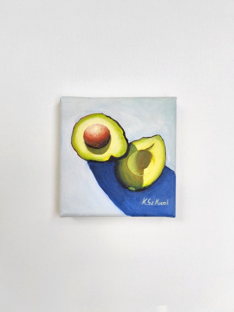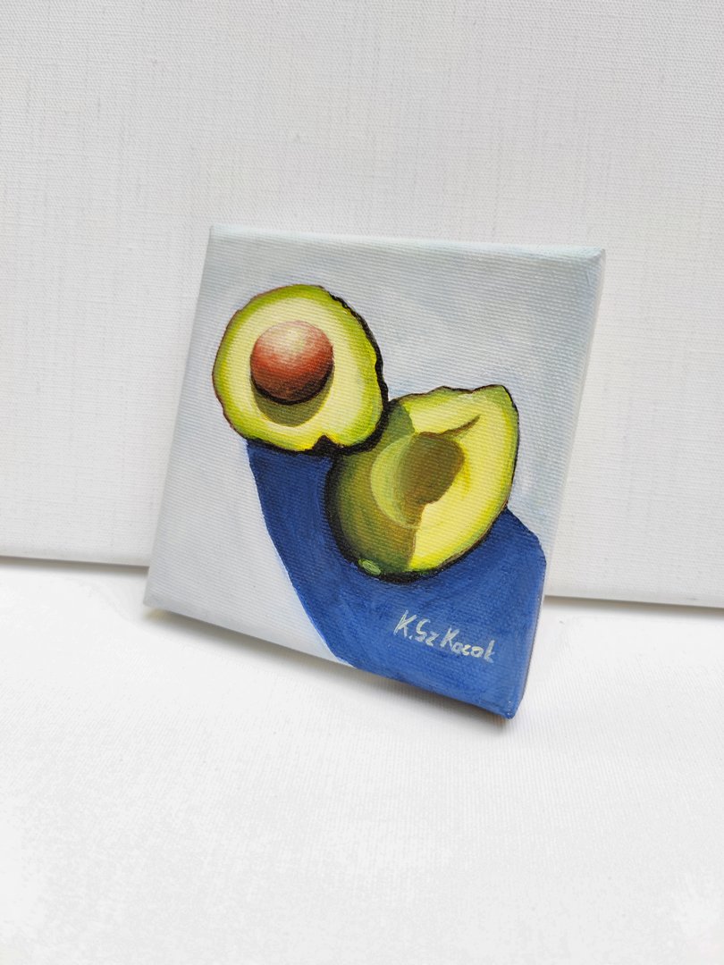 Awokado czyli owoc pełen zdrowia. Zieleń, żółć, brąz i odcienie niebieskiego tworzą przyjemne dla oka zestawienie. Prosta kompozycja eksponuje głównego bohatera. Z pewnością ucieszy wielbicieli awokado.