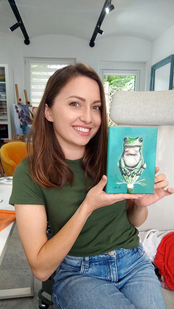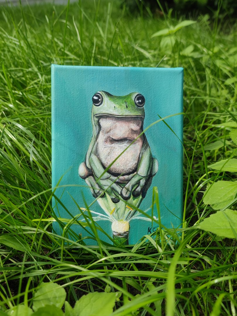 Bohaterką tego obrazu jest oczywiście żaba. Całość utrzymana w zielonej kolorystyce na niewielkim formacie może uzupełnić kolekcję wielbicieli tego cudownego zwierzęcia i stanowić uroczy prezent.