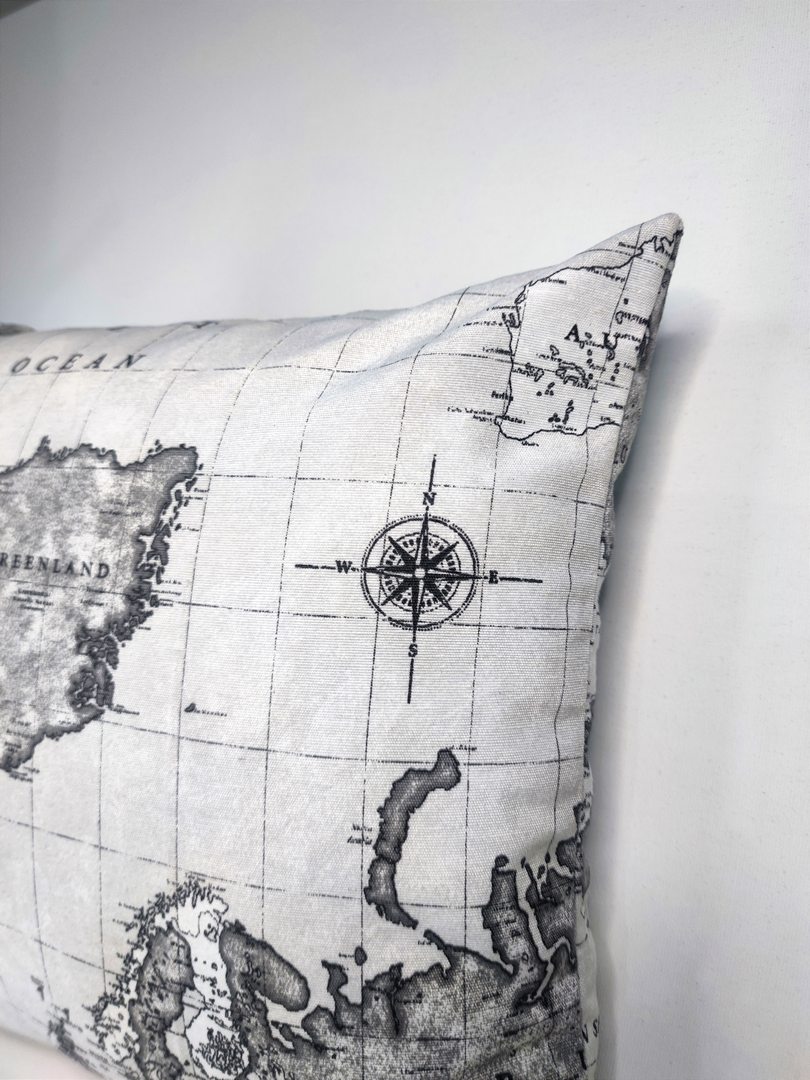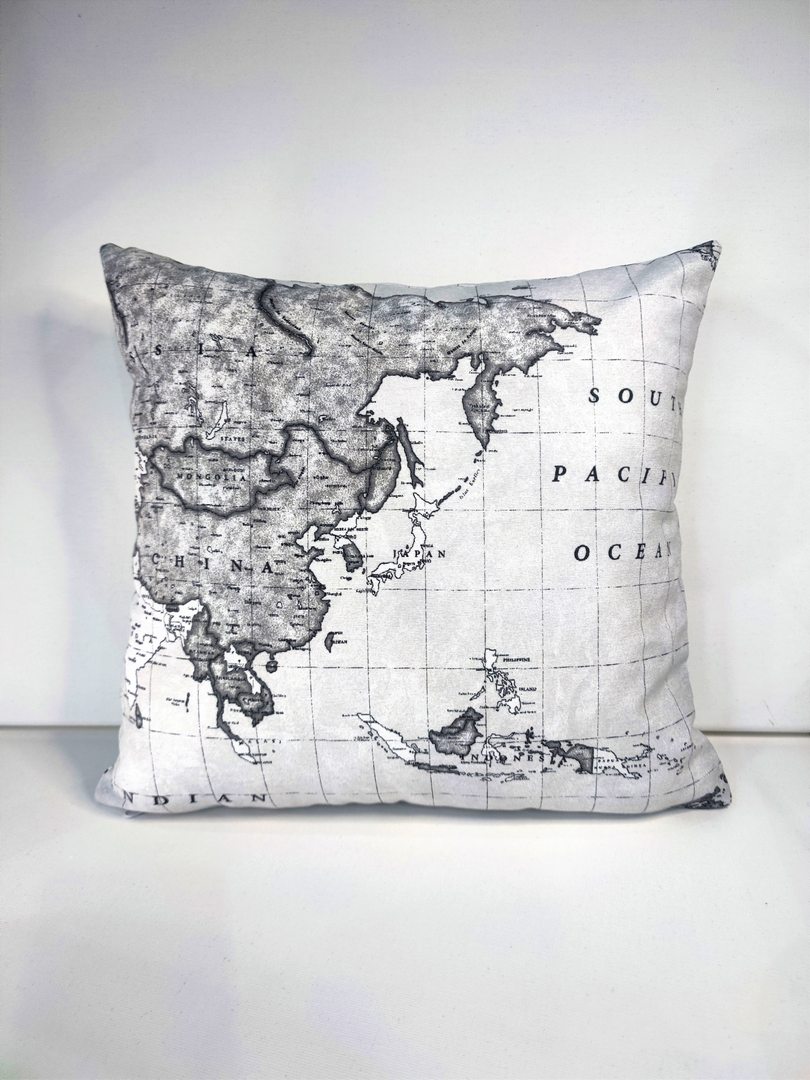 Poszewka wykonana jest tkaniny bawełnianej z mapą świata odcieniach czerni i bieli. Jest ciekawym elementem dekoracyjnym. Posiada wszyty zamek błyskawiczny. Produkt w całości uszyto w Polsce. Wkład do poduszki sprzedawany jest osobno.