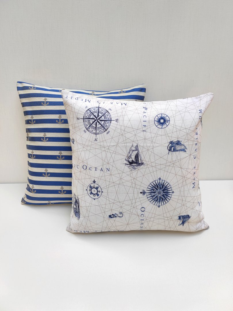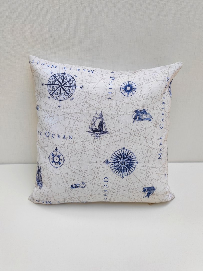 Marynistyczna poszewka wykonana jest z wzorzystej tkaniny. Kolory które dominują to niebieski oraz ecru. Poszewka posiada wszyty zamek błyskawiczny. Świetnie dopełni wystrój wnętrza, zwłaszcza wielbicieli nadmorskich klimatów. Produkt w całości uszyto w Polsce. Wkład do poduszki sprzedawany jest osobno.